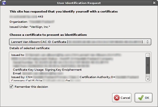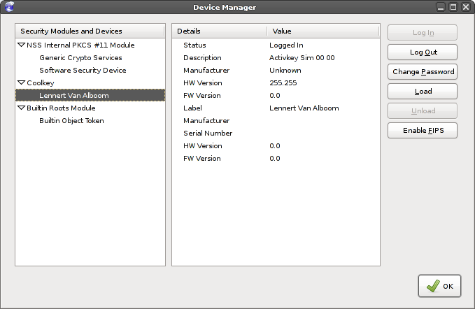 First of all, you'll have to get the proper security device installed. This will be the CoolKey device that you configured before. In FireFox (or IceWeasel... what's in a name) go to: Edit → Preferences → Advanced → Encryption → Security Devices. In the Device Manager, load a new device named "CoolKey" (or whatever you want it to be) and select as module: